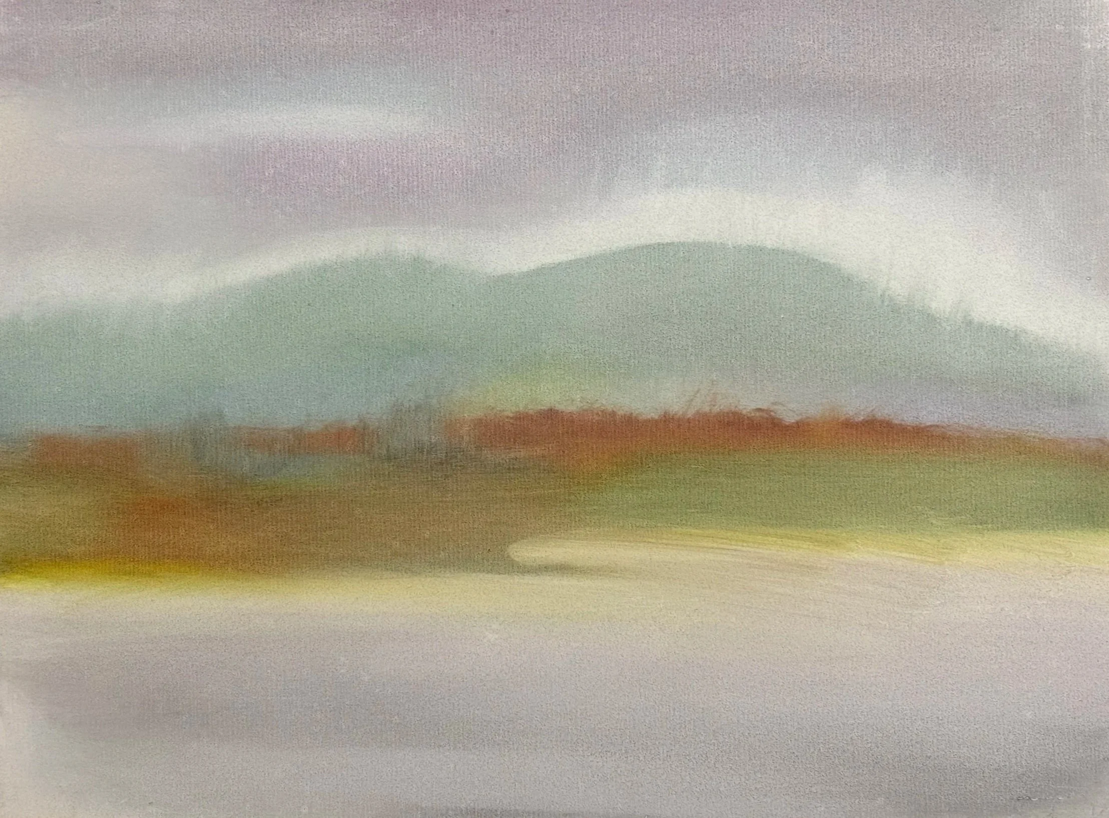 Today is overcast. It flattens the landscape making it soft and chalky with barely a cast shadow. What the landscape loses in shadows, it more than makes up for in the mottled, dulcet hues of lavender, pistachio, and ochre. I stop halfway to sketch the colours.