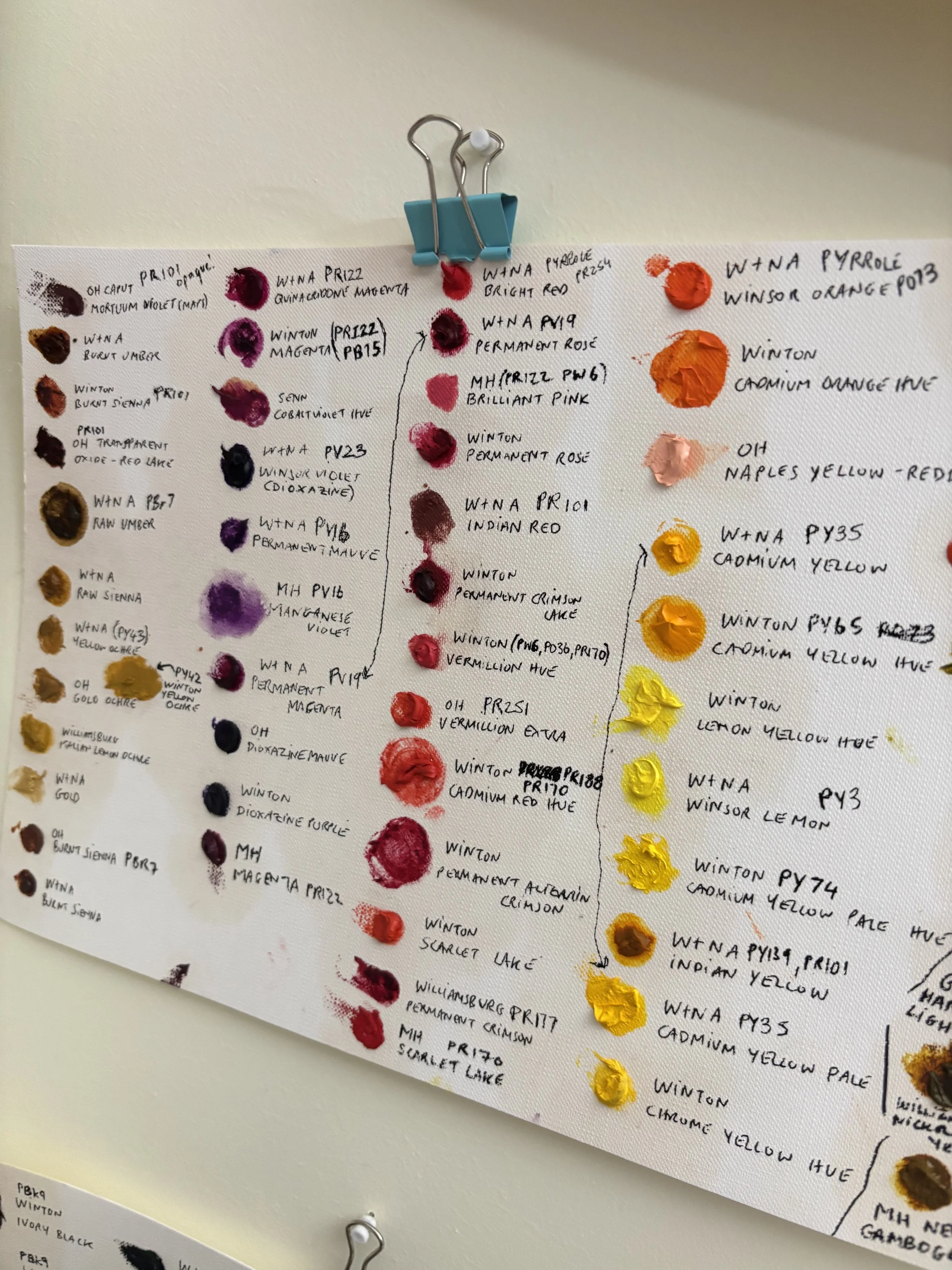 Stream of consciousness: I’m thinking py150, pv16, and pg18, but I do see some pinks and oranges in my sketches so may need to pull a red hmm I take a look at my reds I need something dull. Indian red looks good but of course despite my attempt at an organised inventory I can’t find it. I’ll go with transparent red oxide old Holland pr101. Ugh the pr101s are a mess and all different (burnt sienna, indian red, red oxide, caput mortum). My mentor, Pete, mentioned it might have to do with particle density.