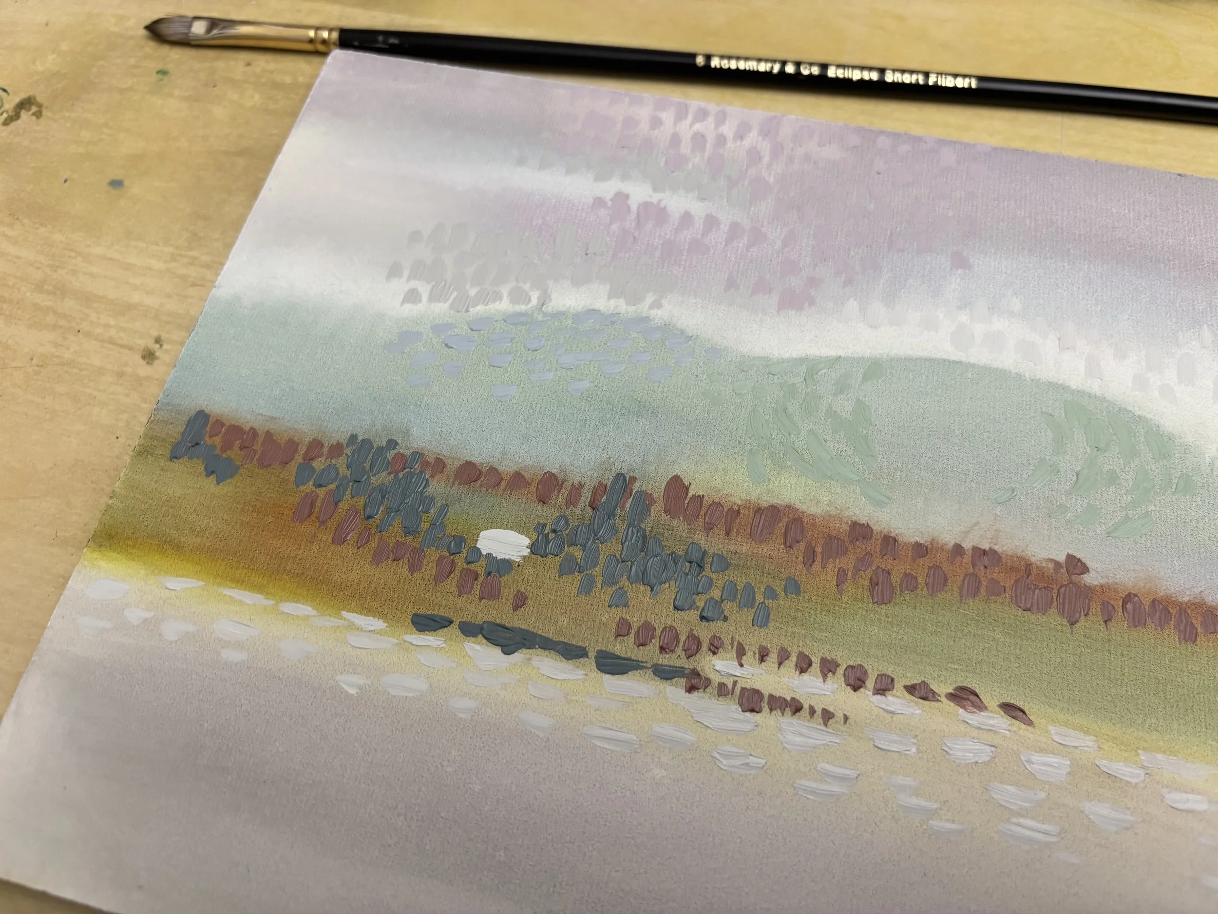 After my studies I prep a board and rub some thin layers of oil paint in to create a barely there ground and I start to dot and dash my colours on.