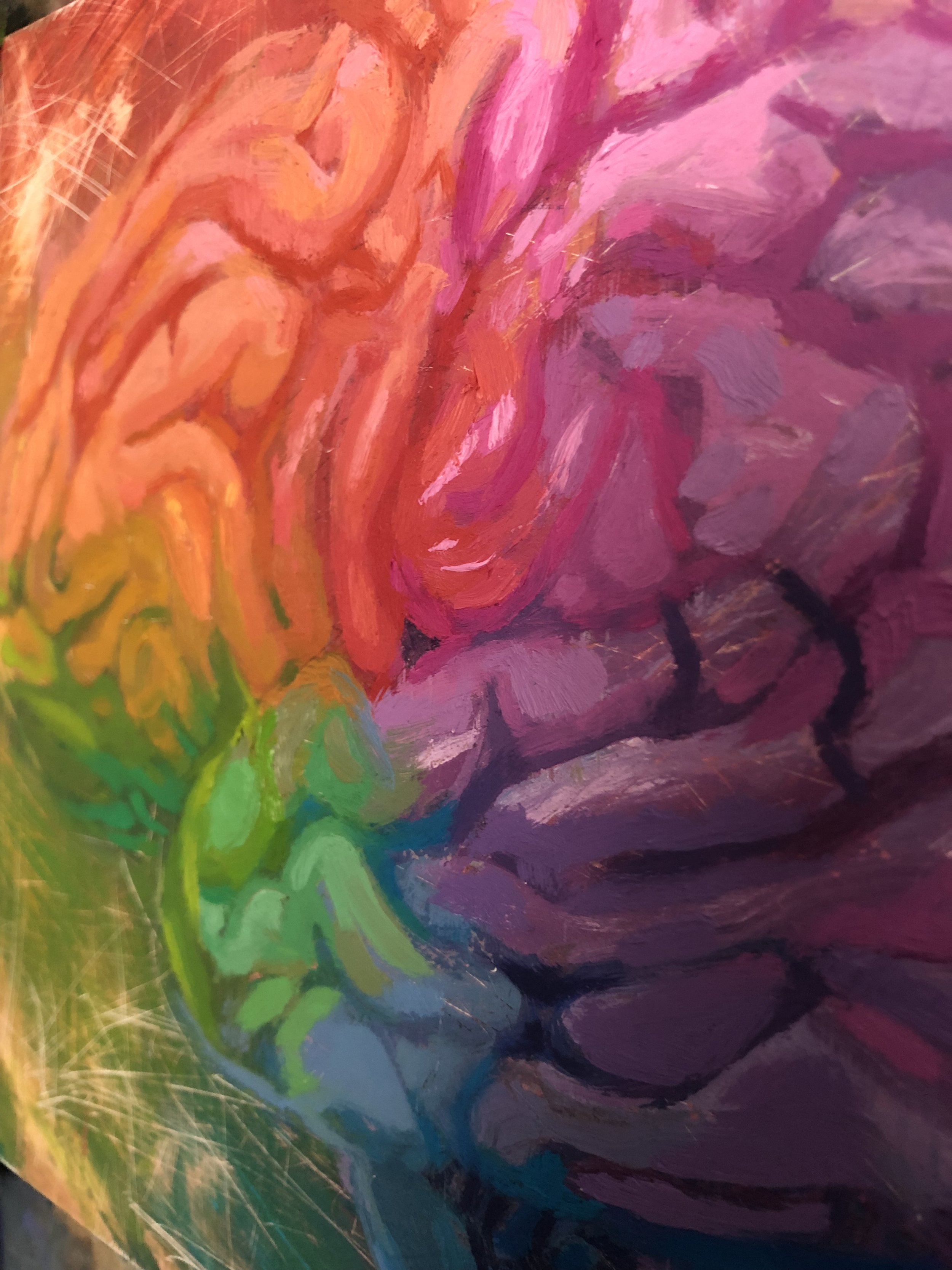 I came across this term 'neuroqueer' coined by Nick Walker and it really fits for me right now. It has inspired this painting of a rainbow brain, currently a work in progress on the easel. The colours are dialled up to eleven and I'm going with it.